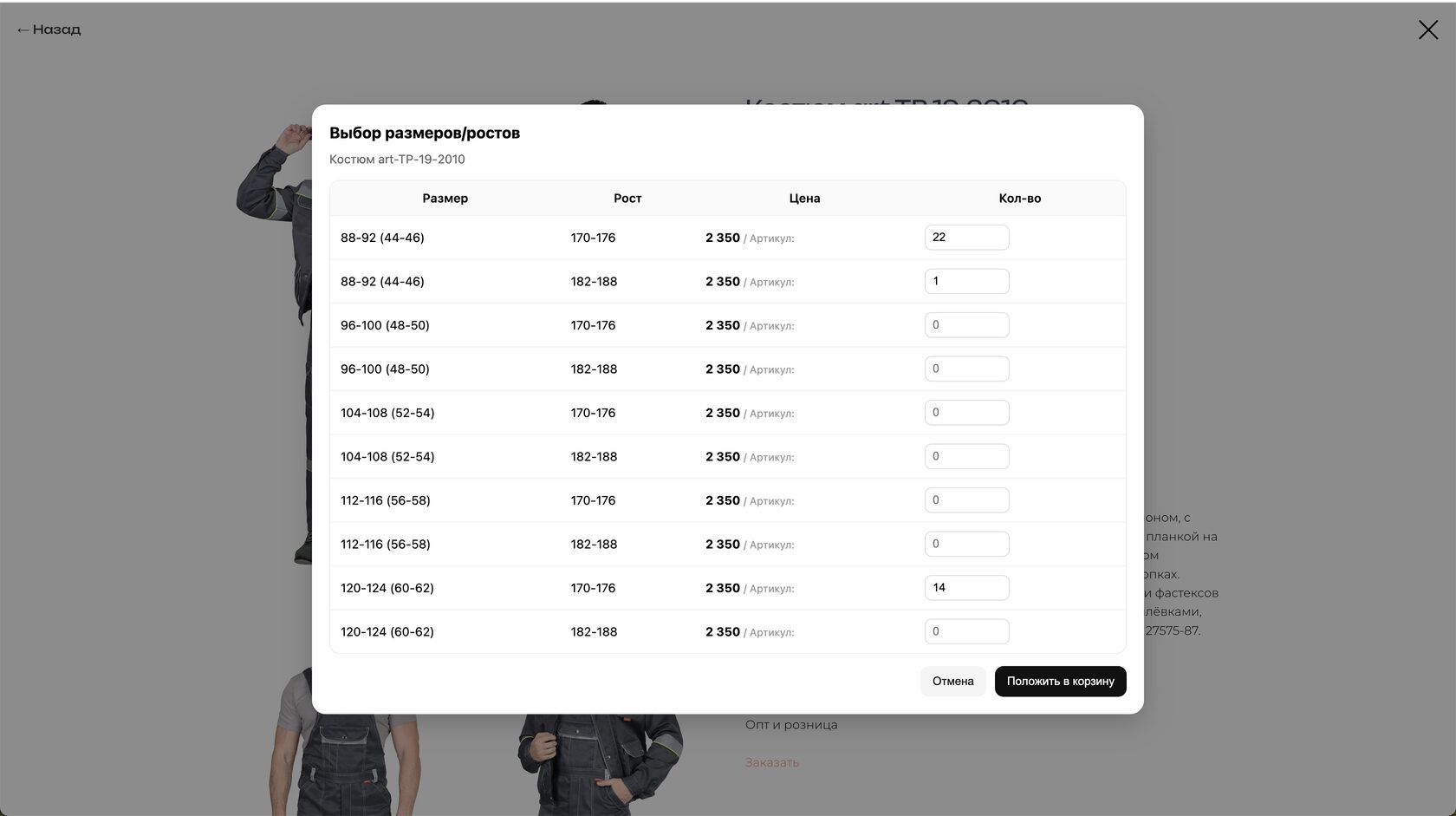 2) Укажите количества в всплывающей таблице: каждый размер/рост — отдельная строка, справа